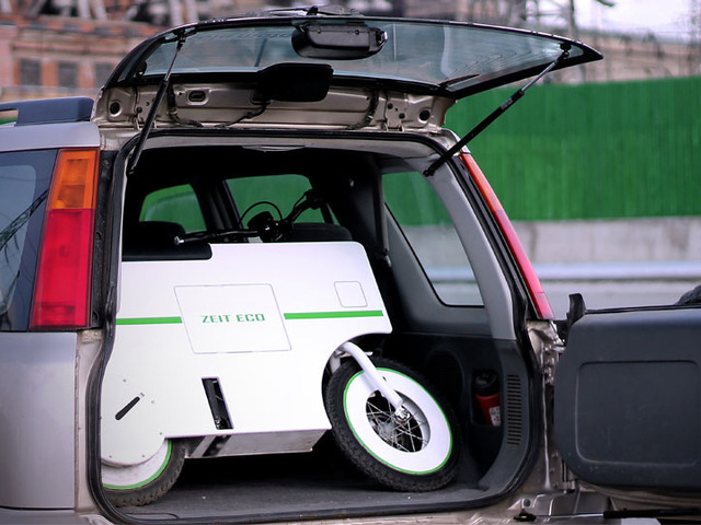 Zeit Eco, realizzato intorno a un robusto telaio in alluminio, è spinto da un piccolo propulsore elettrico, potente quanto basta per muoversi agilmente nel traffico cittadino, e in grado di percorrere una trentina di chilometri con una ricarica.